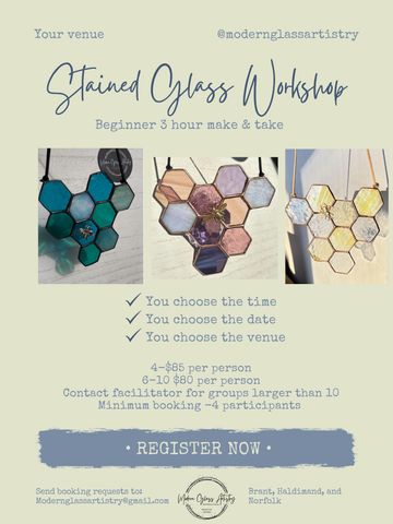 Unleash your creativity at our Stained Glass Mini Honeycomb workshop! In this a 4-hour beginner-friendly class you'll learn how to create a honeycomb design with colorful stained glass. Choose your preferred time, date, and venue for a personalized artistic adventure. Let your imagination shine as you craft your own unique masterpiece in a fun and supportive environment. Discover the joy of working with stained glass and unleash your inner artist.